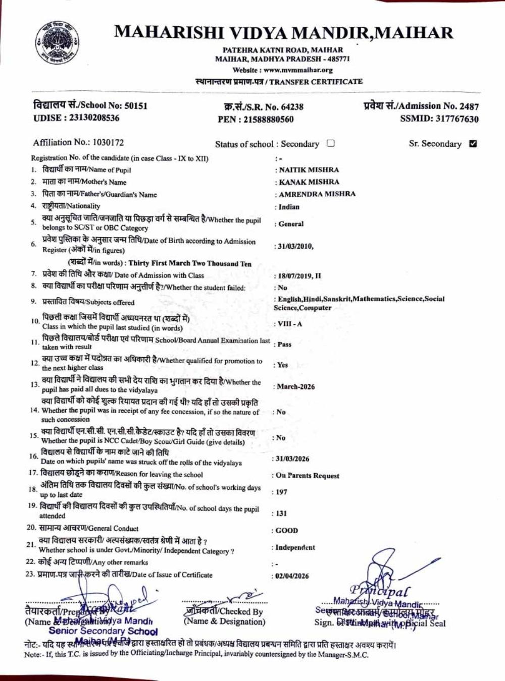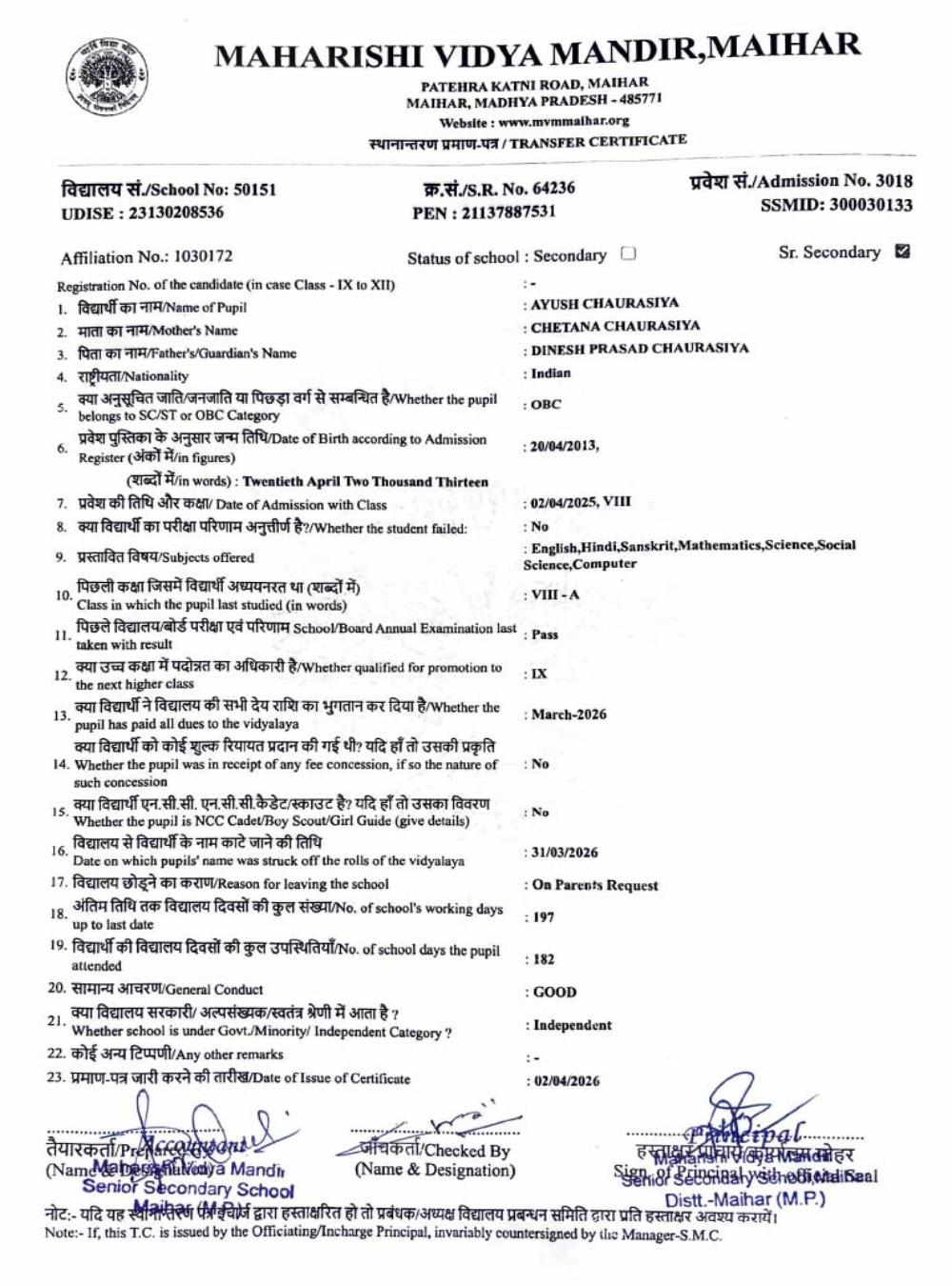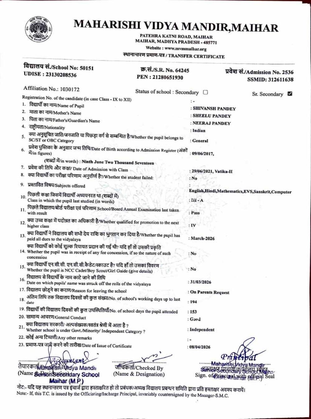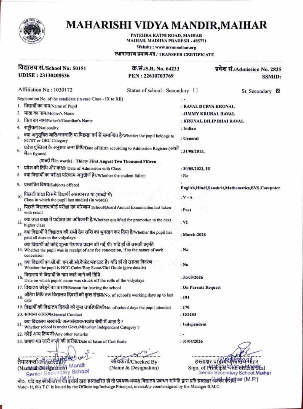 | 25 | 2986 | PUSHPENDRA KUMAR SAHU | VI | ||