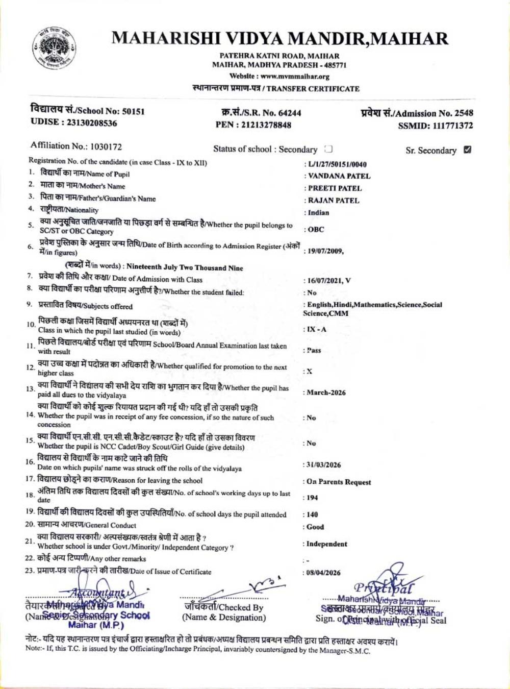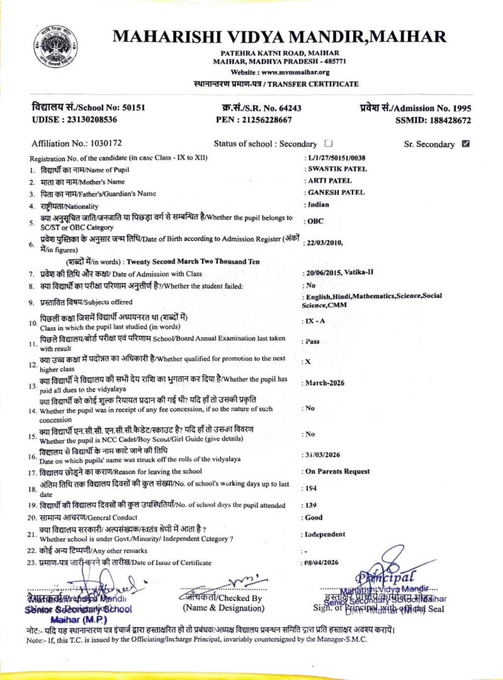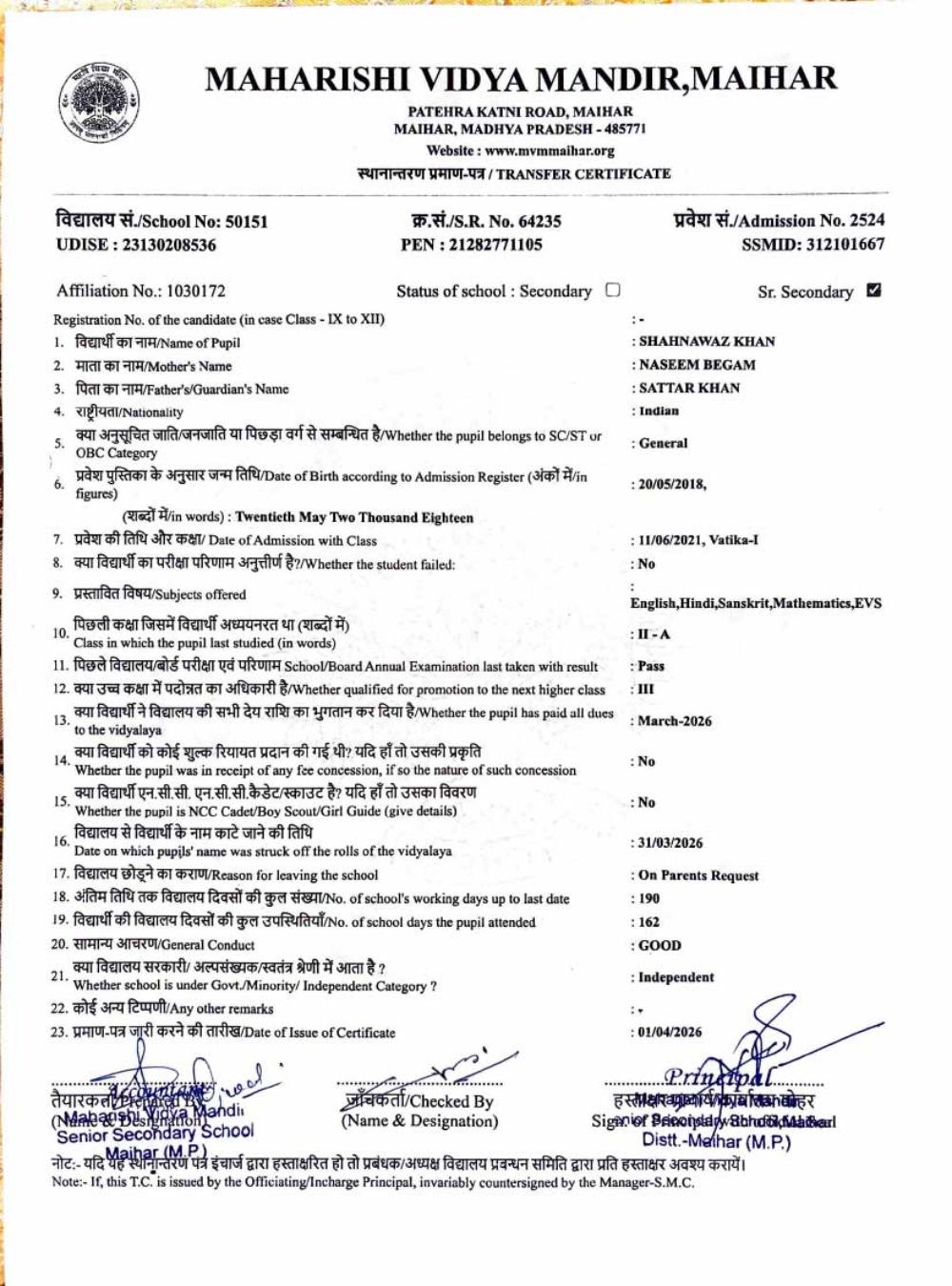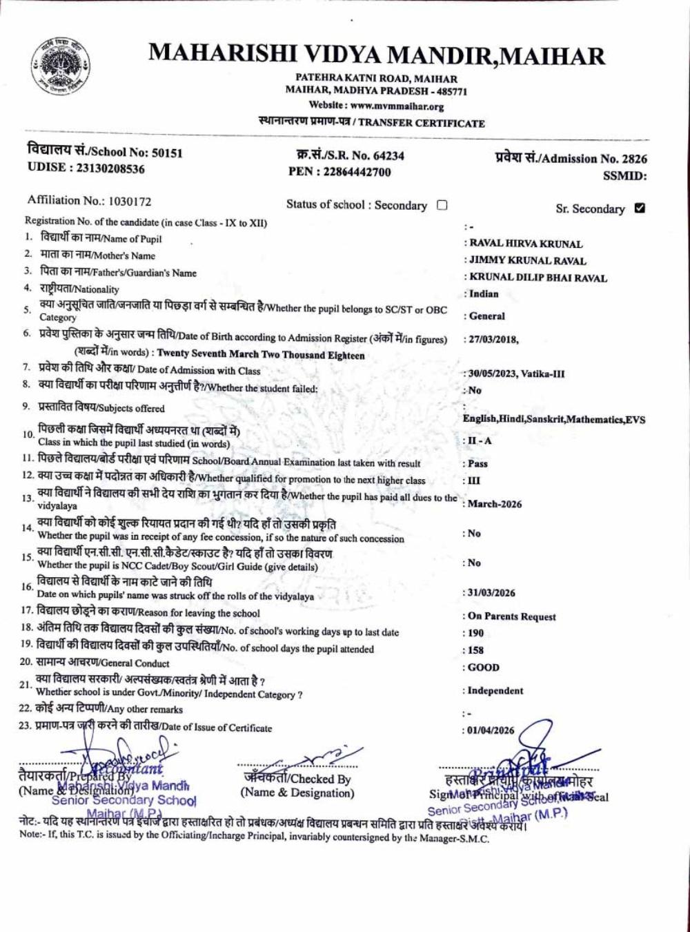 | 25 | 2986 | PUSHPENDRA KUMAR SAHU | VI | ||