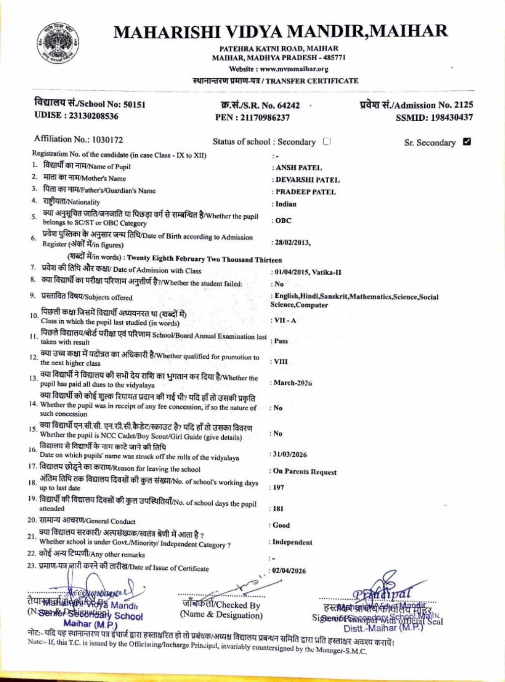 | 6 | 2125 | ANSH PATEL | VIII | ||