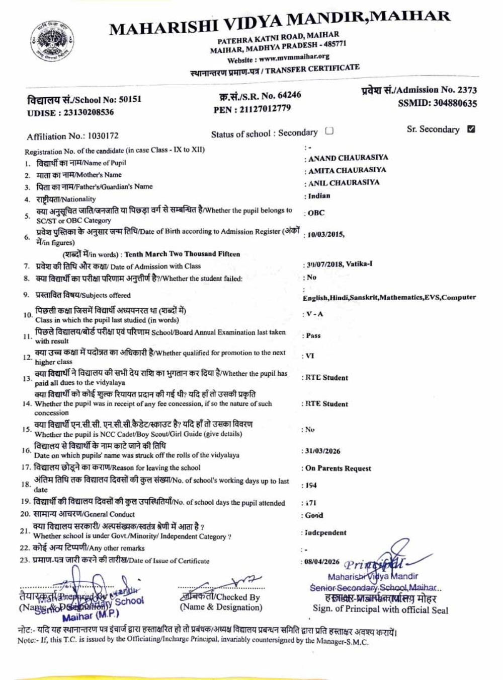 | 8 | 2373 | ANAND CHAURASIYA | VI | ||