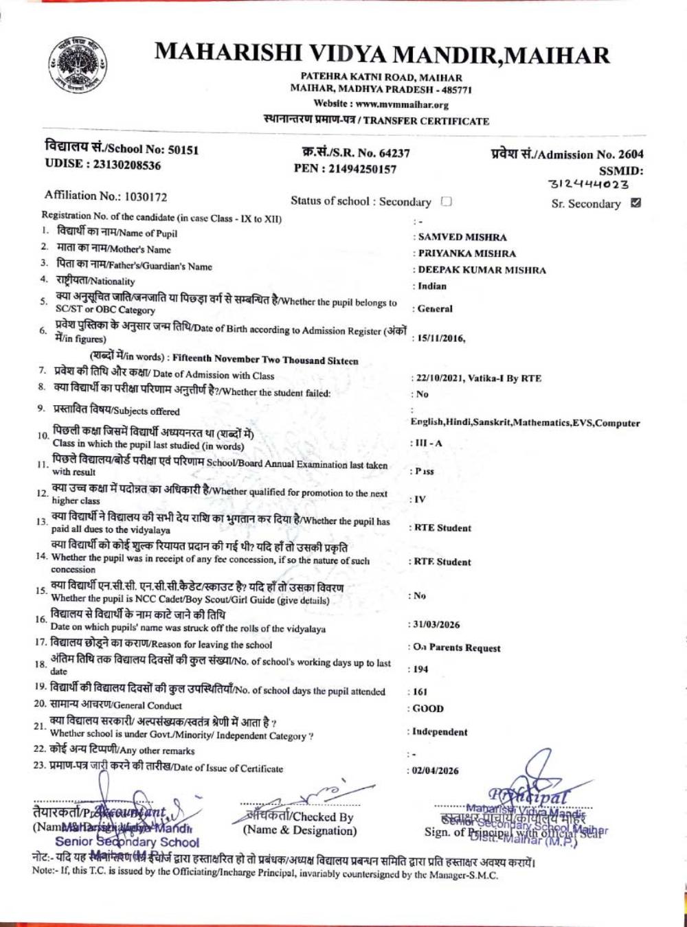 | 12 | 2604 | SAMVED MISHRA | IV | ||
