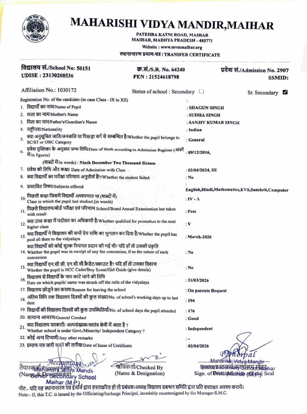 | 10 | 2907 | SHAGUN SINGH | V | ||