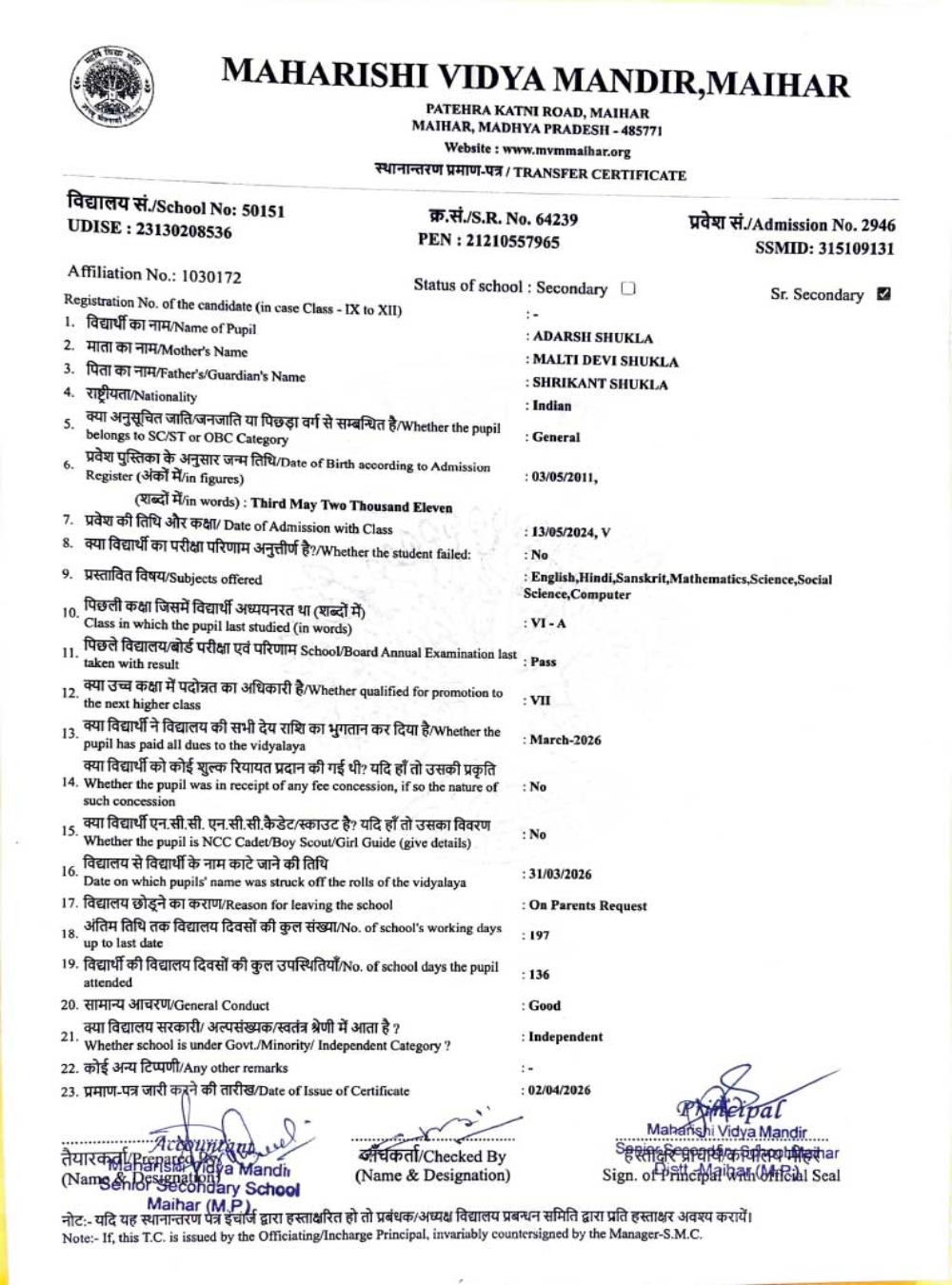 | 7 | 2946 | ADARSH SHUKLA | VII | ||